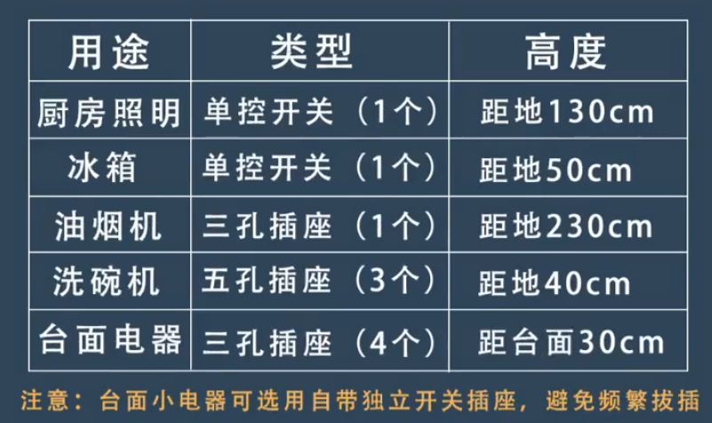 温馨提示:所有插座都要装在离水龙头和灶台较远的位置,减少安全问题。