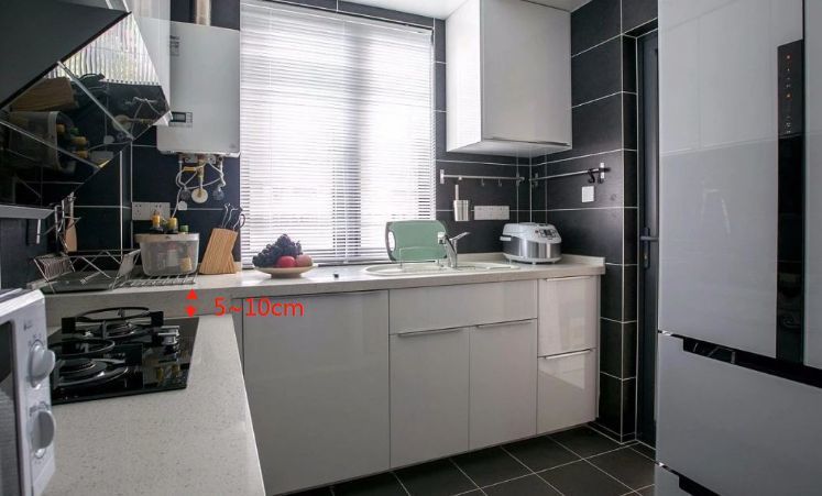 备菜区台面要稍微高一点,不用弯腰太低,腰酸背痛;烹饪区台面稍微低一点,胳膊就不需要架太高,影响炒菜速度,两个台面相差5-10cm就够了。