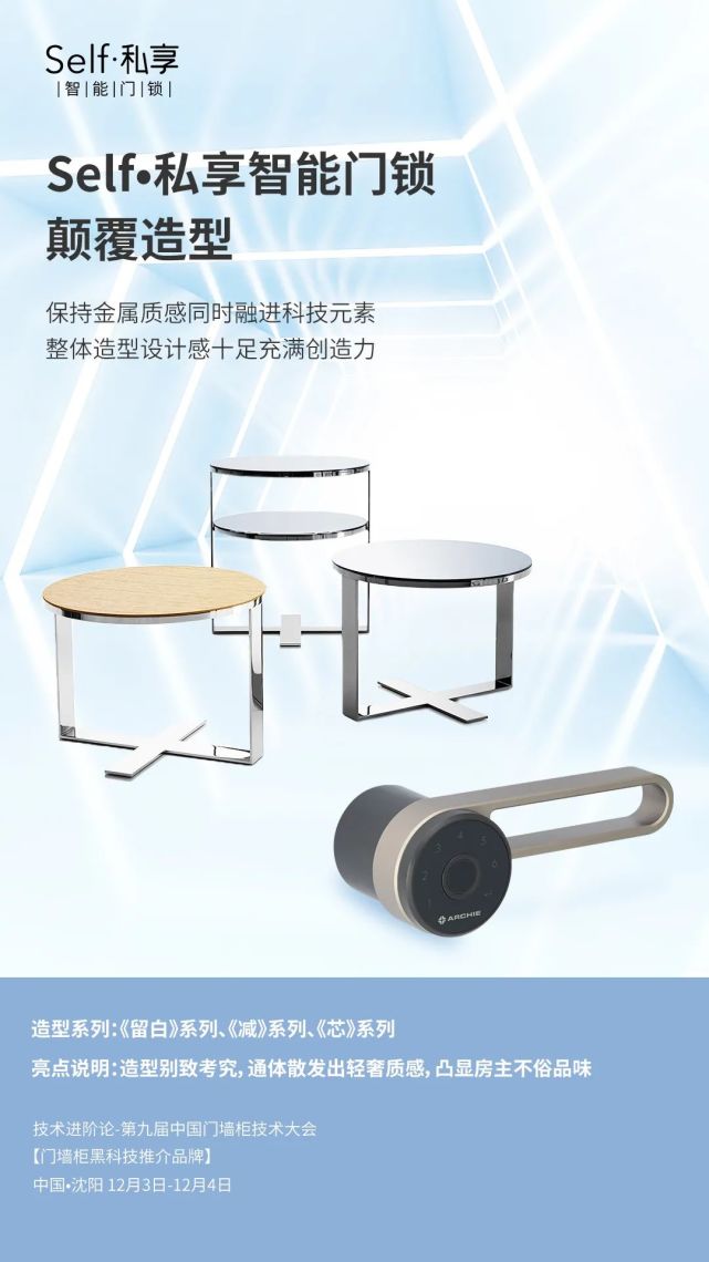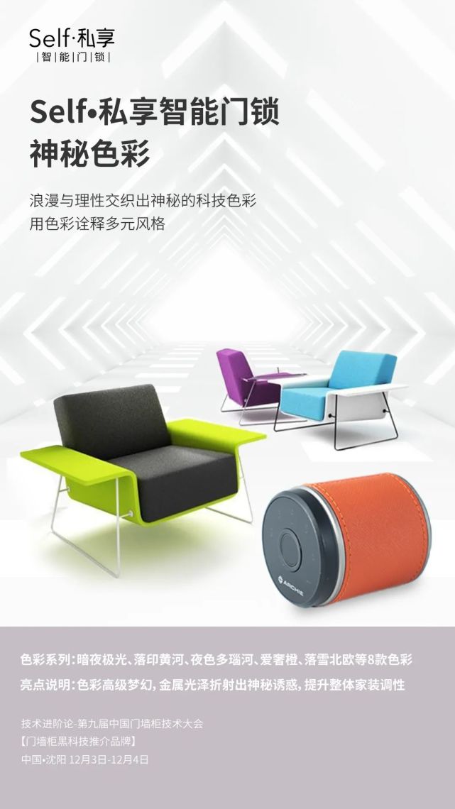 【Self·私享智能门锁】 神秘色彩 浪漫与理性交织出神秘的科技色彩 用色彩诠释多元风格 色彩系列:暗夜极光、落印黄河、夜色多瑙河、爱奢橙、落雪北欧等8款色彩 亮点说明:色彩高级梦幻,金属光泽折射出神秘诱惑,提升整体家装调性 技术进阶论-第九届中国门墙柜技术大会 【门墙柜黑科技推介品牌】