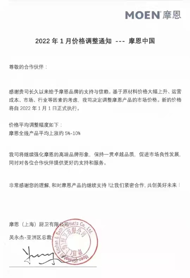 摩恩中国早在2021年11月就发布了产品调价通知,自2022年1月1日起,摩恩中国全线产品平均售价上调5-10%。