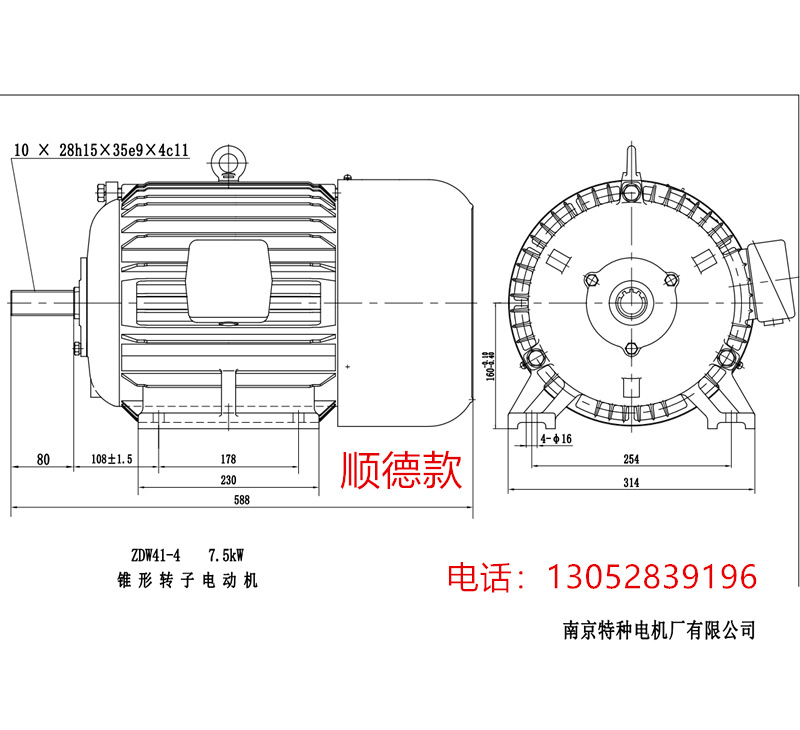 南京特种电机厂有限公司ZDW41-4 7.5KW锥形刹车电机,此电机为卧式,电机轴头上带皮带轮