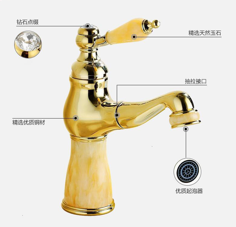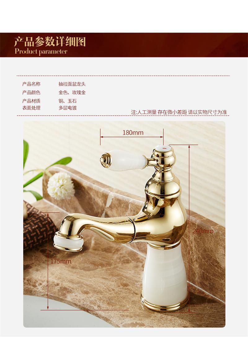 欧式天然玉石龙头全铜抽拉式金色水龙头台盆单孔面盆冷热水龙头