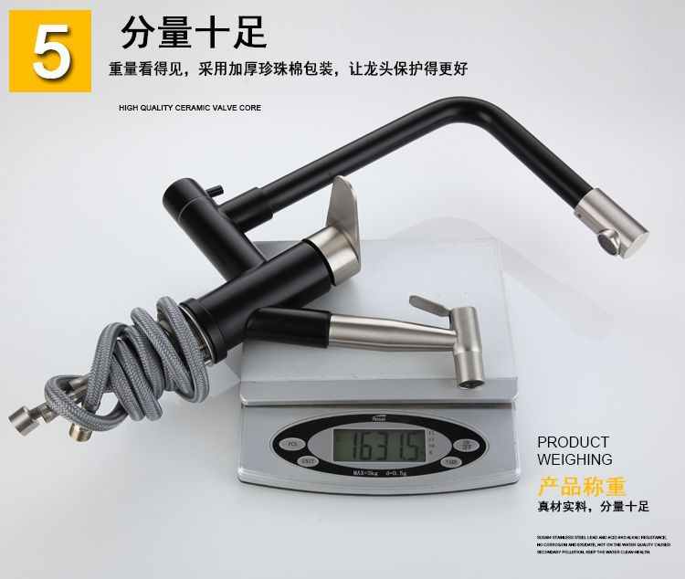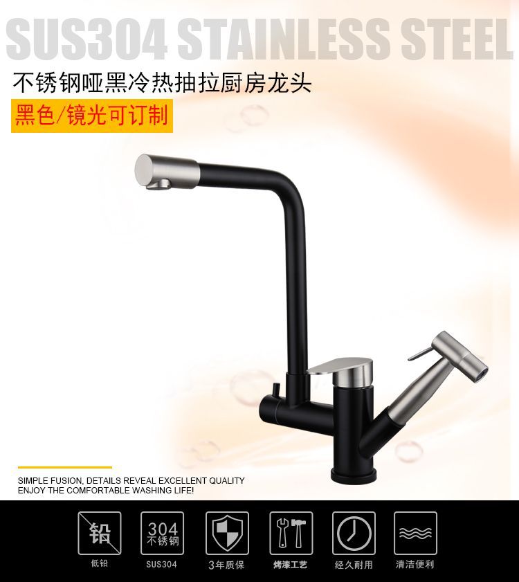 黑色烤漆304不锈钢冷热洗菜盆抽拉式增压喷枪拉丝旋转厨房水龙头