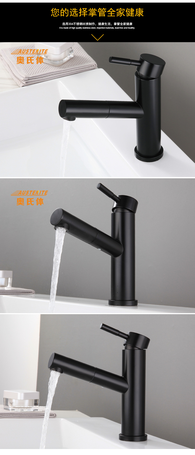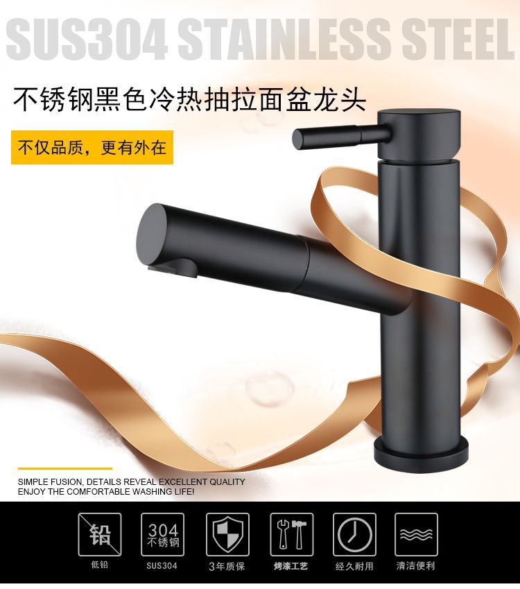 304不锈钢黑色面盆抽拉龙头单孔冷热可旋转浴室洗手盆水龙头厂家