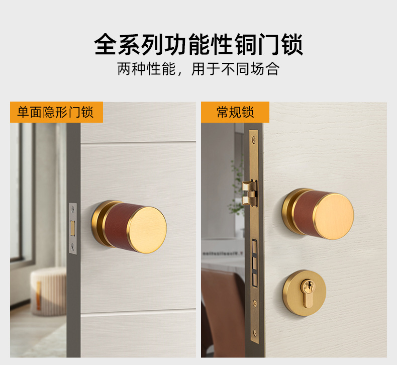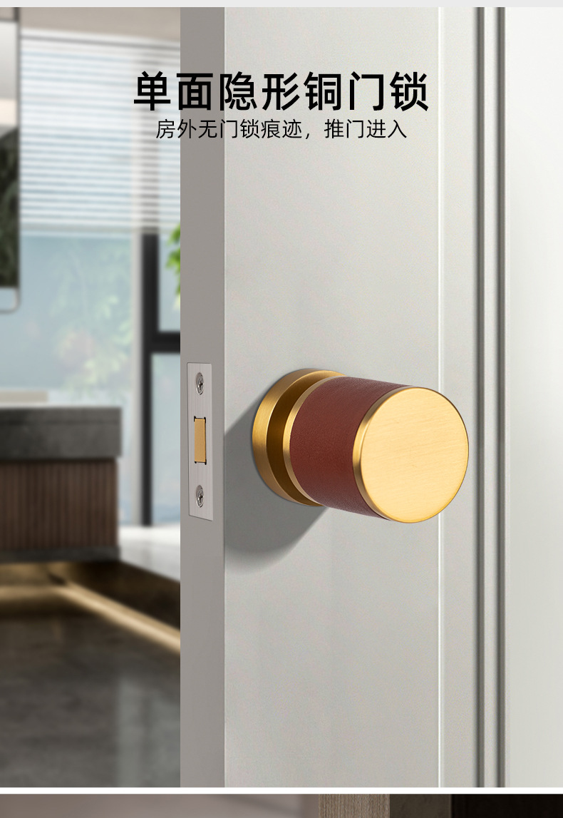 新品高档纯铜隐形门锁 室内静音房门锁黑色真皮球形单面锁门把手