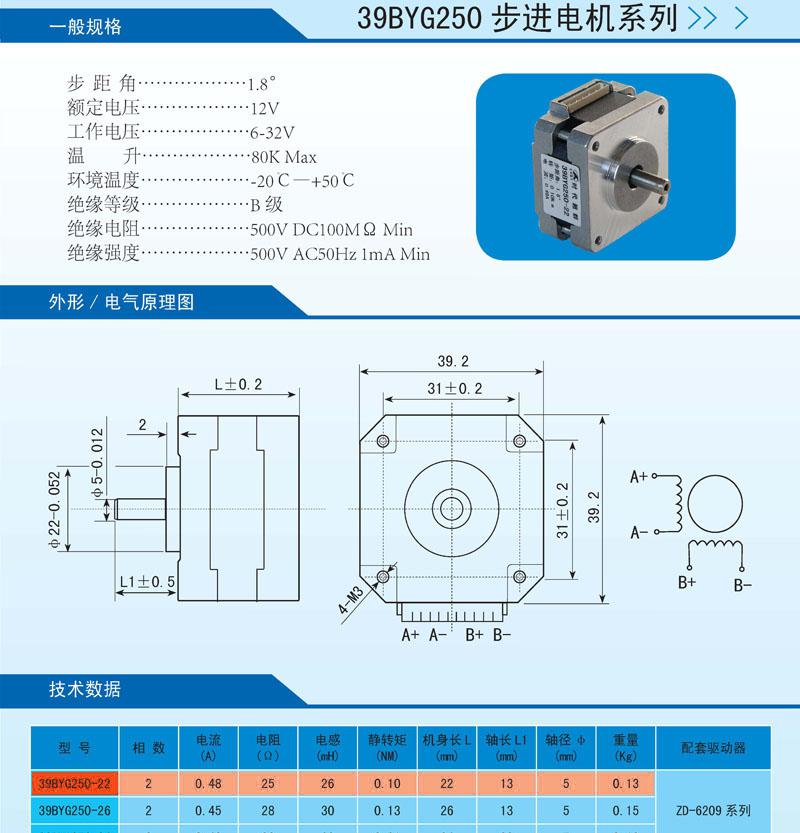 步进电机 | 39BYG250-22 | 1.8 | 12 | 0.48 | 0.10 | 0.13 | 36 |