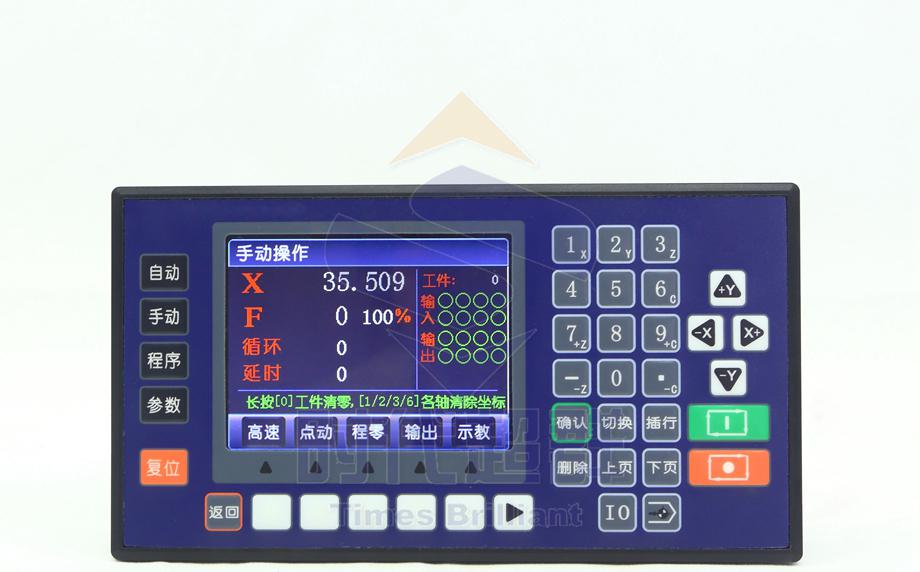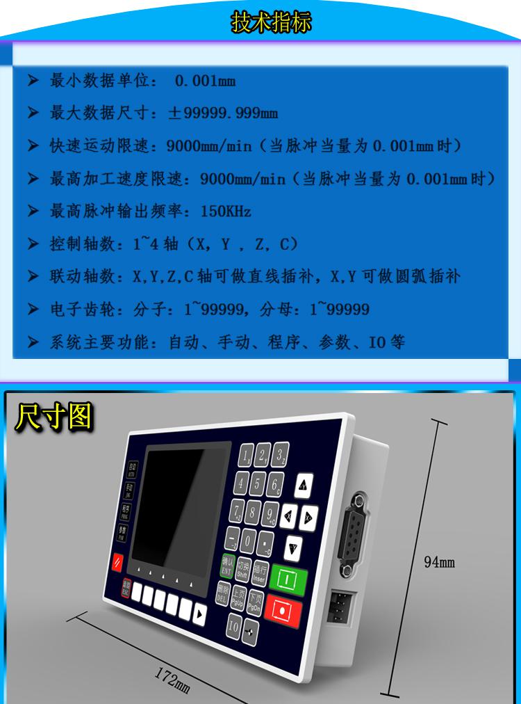 1.2 系统资源控制系统主要由以下几部分组成·3.5 寸彩色液晶屏,分辨率320*240·触点按键阵列(38 键)·专用运动控制芯片,4 轴差分脉冲输出(信号输出为:方向+ 方向- 脉冲+ 脉冲-)·输入/ 输出(16 路光电隔离24V 输入,8 路光电隔离24V 输出,单通道额定500mA)·485 接口,可与PLC 混合编程·24V 双电源隔离供电,分为系统供电与IO 供电·编码器接口,可做专机·USB 接口,系统供电,上位机软件或图片下载使用·**大程序行480 行·可与外部IO 扩展板相连1.3 技术指标**小数据单位: 0.001mm**大数据尺寸:±99999.999mm快速运动限速:9000mm/min(当脉冲当量为0.001mm 时)**高加工速度限速:9000mm/min(当脉冲当量为0.001mm 时)**高脉冲输出频率:150KHz控制轴数:1—4 轴(X,Y , Z, C)联动轴数:X,Y,Z,C 轴可做直线插补,X,Y 可做圆弧插补电子齿轮:分子:1—99999,分母:1—99999系统主要功能:自动、手动、程序、参数、IO 等
