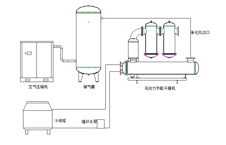 压缩空气由储气罐进入超冷却器进行冷却,在冷却的过程中高温气体在与水的冷热交换中降低温度。在这个交换过程中压缩空气中的气态水降低至露点温度,液化经过排污口进入储水器准备集中排放,冷却后的压缩空气带有一定含量的水份流入气液分离器进行分离,分离后的水进入储水器。再经过两个超精密过滤器进行再次净化,从而得到净化空气。净化后的压缩空气流向生产车间。超冷却器,过滤器,分离器产生的冷凝水集中进入到储水器后经过电子式液位零气损排水器排出,在这整个净化过程中不会损耗压缩空气。