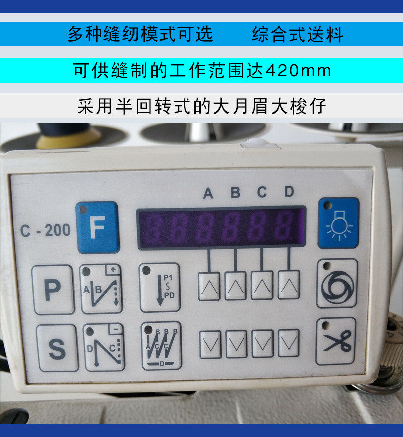 特点:采用三同步综合送料,送料力量强大,缝制特厚物品线迹均匀美观,缝制范围广达420MM,适用于大型物品的缝制,梭心的卷线位置设计在机头上方,操作方便,采用大旋梭,减少更换底线次数,提高了缝制效率.适用于箱包,沙发家具,高尔夫球袋,安全带,运动用品等各种厚重物料的缝制。