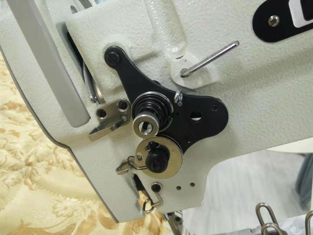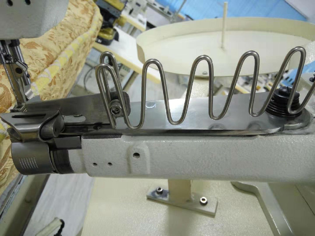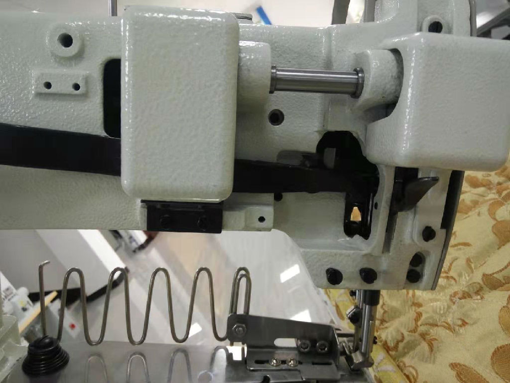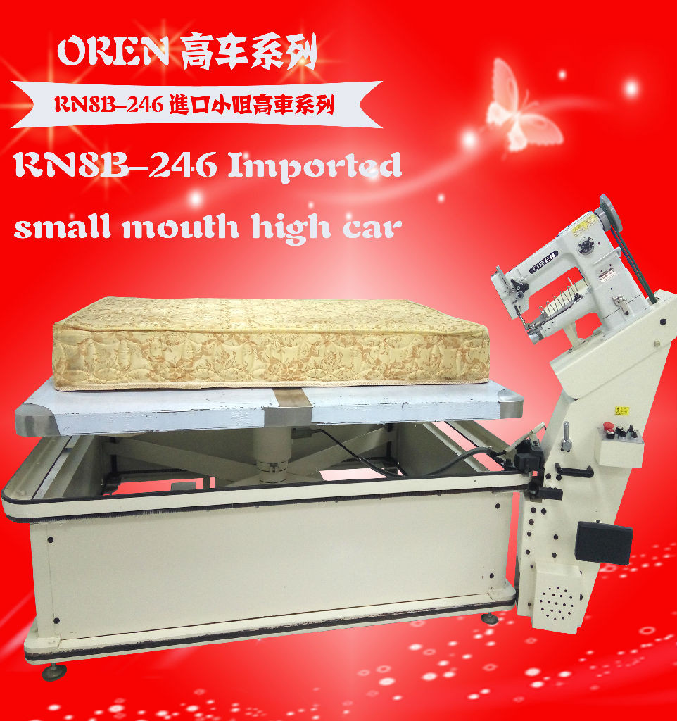本机主要用于席梦思床垫的缝制,完成床垫面料与墙布之间的边缘包缝工作,也适用于其它床褥、毛毯、沙发软垫、睡袋的缝制。机头可自动升降,以适应缝制各种高度的床垫。行走箱与机头驱动采用离合电机,转角减速方便易控,机头采用滑杆挑线,立式旋梭勾线,构成双线锁式线迹。上下轴用同步齿形带传动;杠杆式针式针距调节机构。采用综合下送料、针送料和交替压脚上送料,以及高压脚行程,高压脚提升间隙和较大线迹长度,配合推拉式不锈钢专业围边夹具;可轻易处理难于传送的物料和多层厚重皮革。并安装离合器式安全装置;以防负荷引起的机器损伤,使缝纫操作更加平稳方便。推板高度可调,人机性能更加合理。
