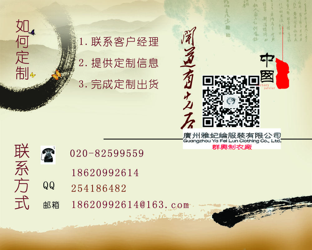 广州雅妃纶服装厂愿在发展中成为广大客户忠实的“战略伙伴”,努力为客户创造价值,达成共赢。欢迎海内外新老客商来人来电来函洽谈合作!谢谢。