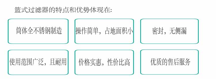 篮式过滤器用于油或其它液体管道上,过滤管道里的杂物,过滤孔面积比通径管面积大于2-3倍.远远超过Y型、T型过滤器过滤面积。滤网结构与其它过滤网不一样,因形状像篮子,故名篮式过滤器。篮式过滤器主要由接管、筒体、滤篮、法兰、法兰盖及紧固件等组成。安装在管道上能除去流体中的较大固体杂质,使机器设备(包括压缩机、泵等)、仪表能正常工作和运转,达到稳定工艺过程,保障安全生产的作用。蓝式过滤器是除去液体中少量固体颗粒的小型设备,可保护压缩机、泵、仪表和其他的正常工作,当流体进入有一定规格的滤网的滤桶后,其杂质被阻挡,而清洁的滤液则由过滤器出口排出,当需要清洗时,只要将可拆卸的滤桶取出,处理后重新装入即可,因此,使用维护极为方便。目前已广泛应用于石油、化工、医药、食品、环保等行业。若将其串连的安装在泵的入口或系统管线的其他部位,则既可以延长泵和其他设备的使用寿命,又能保证整个系统的安全。