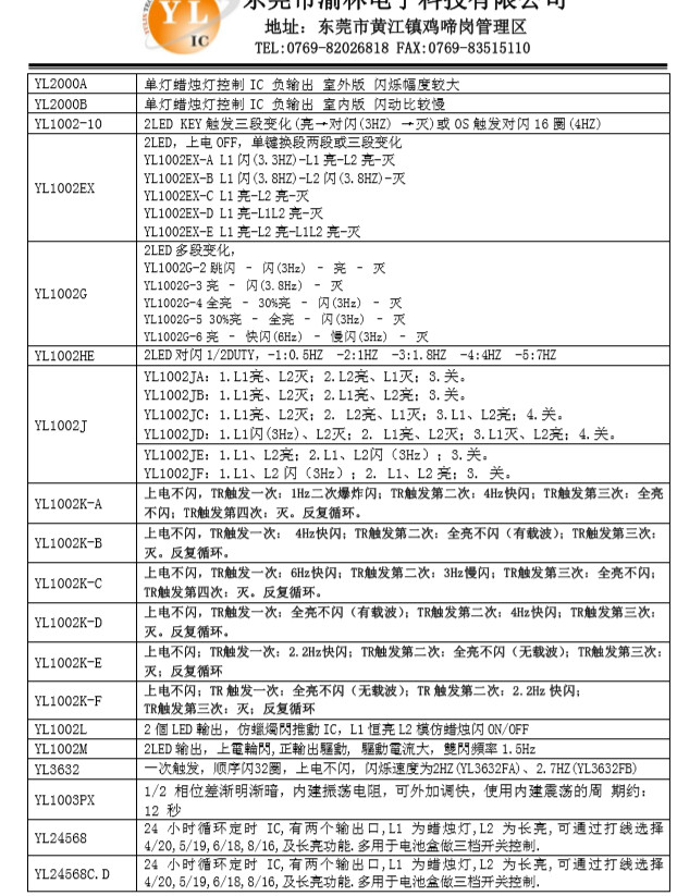 东莞市渝林电子科技有限公司是一家专业从事开发、销售各类消费性IC的公司。主要IC类别有:LED闪烁、音乐、语音、人体感应、门铃、圣诞灯串控制、音效、警报及防盗类、时钟及电子表类等数百种消费性IC产品