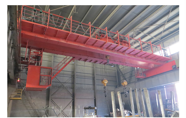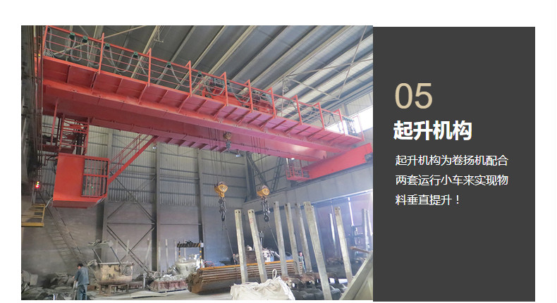 大车运行机构采用8轮2驱动,配轴装式三合一减速器,设有水平导向轮、工具小车用于吊运一般物品,起升机构类似于吊钩桥式起重机,运行机构采用轴装式三合一驱动。