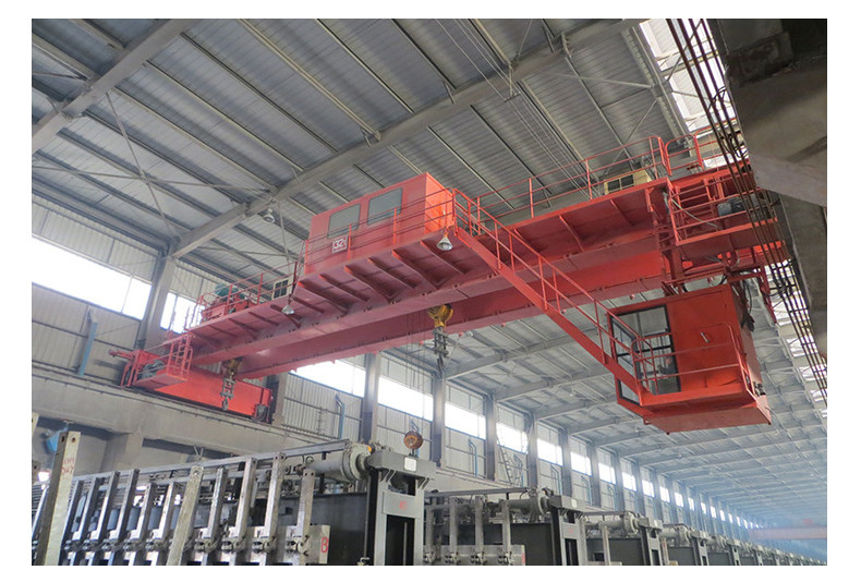 桥架采用三梁三小车结构,主梁上铺有供小车行驶用的轨道,偏轨布置,起重小车和出铝小车同轨道运行,加料小车在另侧轨道运行。