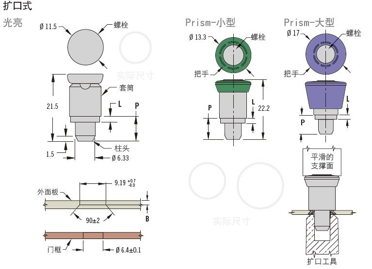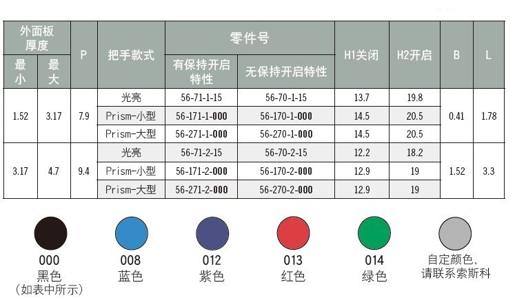 可伸缩销钉设计具有简单的滑动件定位功能开启度定位功能使用户可伸缩插棒,并使把手旋转90°,使插销保持伸缩性Prism Series插棒使你可按颜色选择特别接触点可选选项提供耐用光亮金属表面处理或"Prism"颜色塑料铸压型号,以互补式样及颜色搭配保持打开和非保持打开两种类型可提供提供配套的安装工具以确保每个插棒安装方式适当放置标准及规格索斯科弹簧插棒提供良好强度,铝质面板、钢质面板和硬化钢面板的工作负载分别为1340N (300 lbs.),1800N (400 lbs.)和5400N (1200 lbs.)行业应用汽车、卡车计算机电子关闭展览/签署工业用机柜医疗网络通信贩卖机