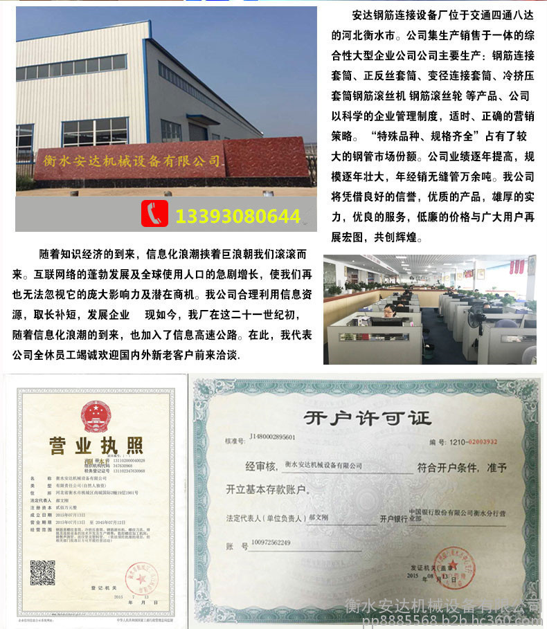 安达以雄厚的实力,先进的技术,完善的服务保障体系,可靠的产品质量,重合同守信用的工作态度,质高价廉的销售宗旨,赢得了各地用户的信赖,产品现已覆盖北京、上海、广州、深圳、辽宁、山东、山西、陕西、湖南、湖北、甘肃等省市建筑市场,深受广大客户的好评,安达愿与社会各界通力合作,紧密互动,共创钢筋连接事业的绚丽未来。