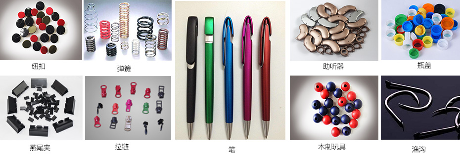 装饰性喷涂:用于笔杆、燕尾夹、木制玩具、助听器、拉链头、纽扣、渔钩、弹簧、瓶盖等小零件的装饰。