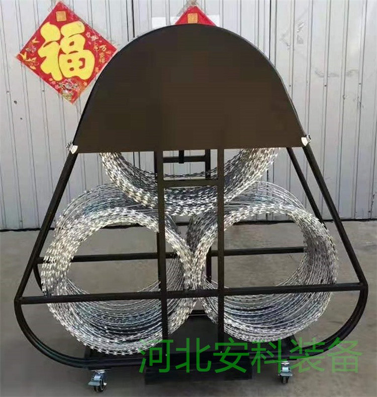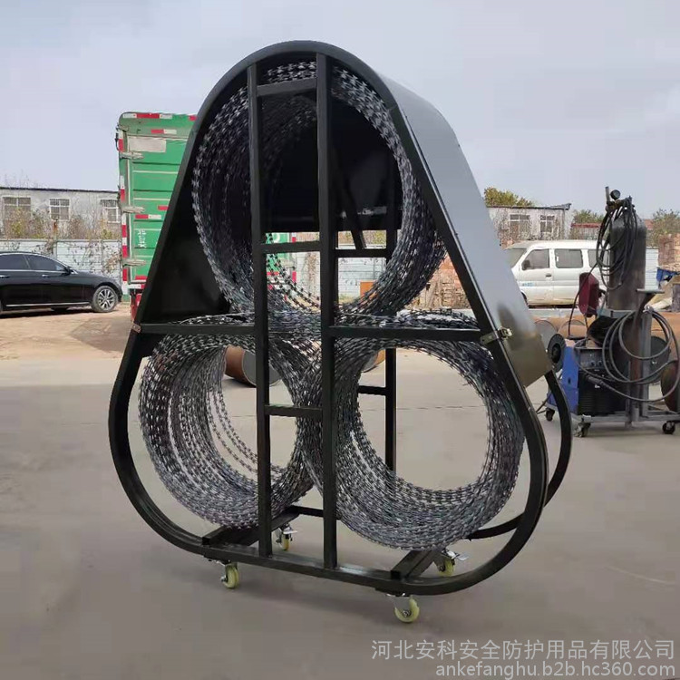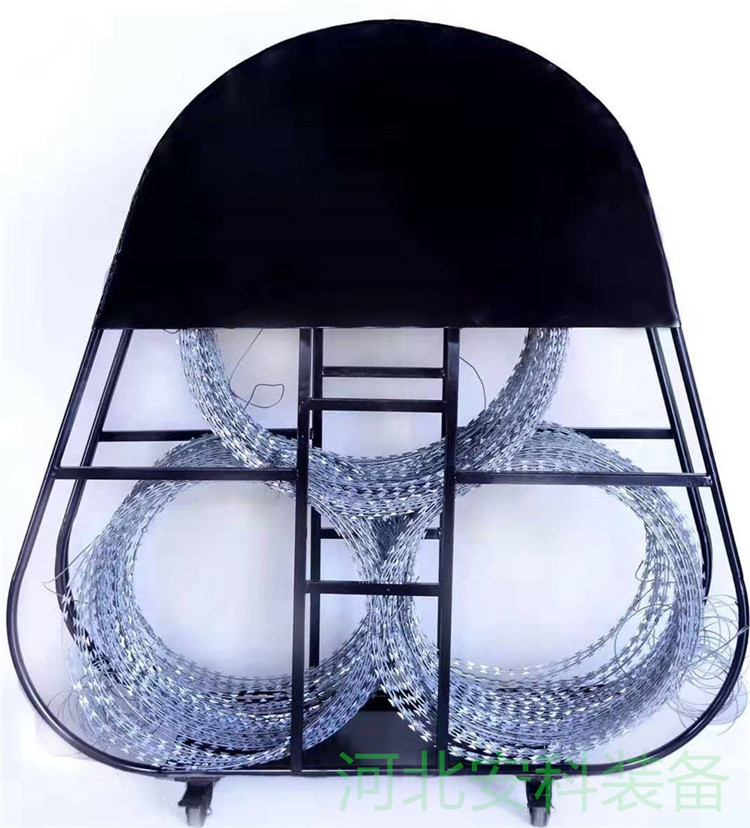防暴阻隔网主要由动支架、定支架、刀片网、回收装置组件等四部分组成。