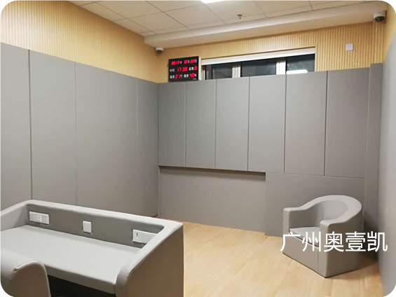 广州奥壹凯建材专业生产销售墙面阻燃软质材料,用于执法办案区、派出所审讯室、办案区、纪检委谈话室、询问室、检察院讯问室、看守所关押室、讯问室、特审室、信息采集室、纪委审查室、禁毒支队、派出所、、拘留所等执法部门量身打造集防撞、阻燃、吸音为一体的防自残、防磕碰的保护性墙面,能很好保护嫌疑人出现自残、撞墙自杀等行为装饰材料。