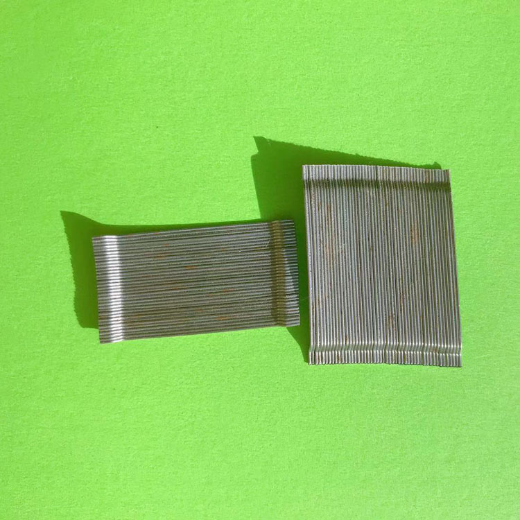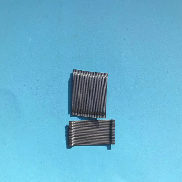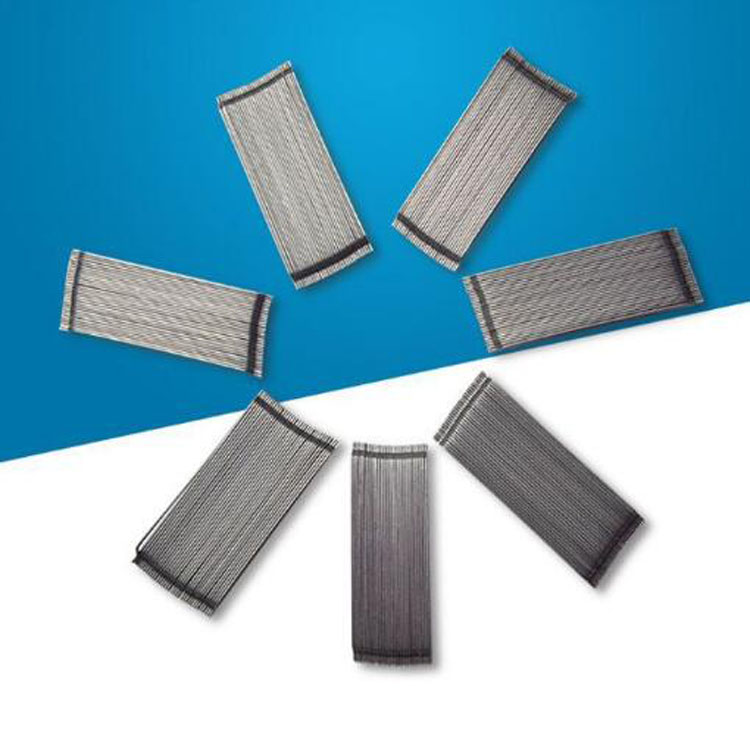 成排钢纤维是采用水溶性胶水将钢丝端钩形钢纤维粘结成排的技术,可保证纤维在混凝土搅