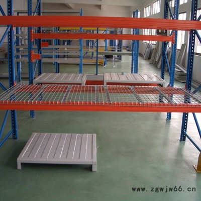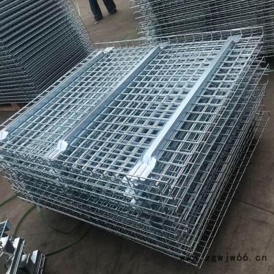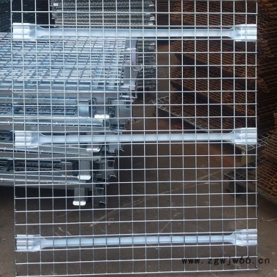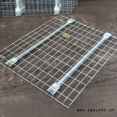 原材料采用高质量的冷拔丝喷焊而成,形成网目为50*50的网片,底部加加强筋加强,两边折弯放置于货架横梁之上,保证货物。一般载重可达1-2t,表面处理为镀锌及喷塑处理。