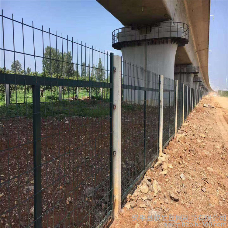 用于铁路两侧的隔离防护设施起隔离和防护的作用的护栏网产品,它被广泛应用于高速公路、铁路、垃圾填埋场试验场地,耐用、美观、视野开阔,具有优良的隔离性能。网片经防腐处理:经除锈、打磨、钝化、硫化等工艺后,采用镀塑处理,色彩为果绿色,镀层厚度为0.5~0.6mm,镀粉采用抗老化性能较佳的进口耐候性树脂粉料,镀层必须颜色一致,表面光滑,不允许有流挂、滴瘤或多余结块。镀件表面应无漏镀、露铁等缺陷。