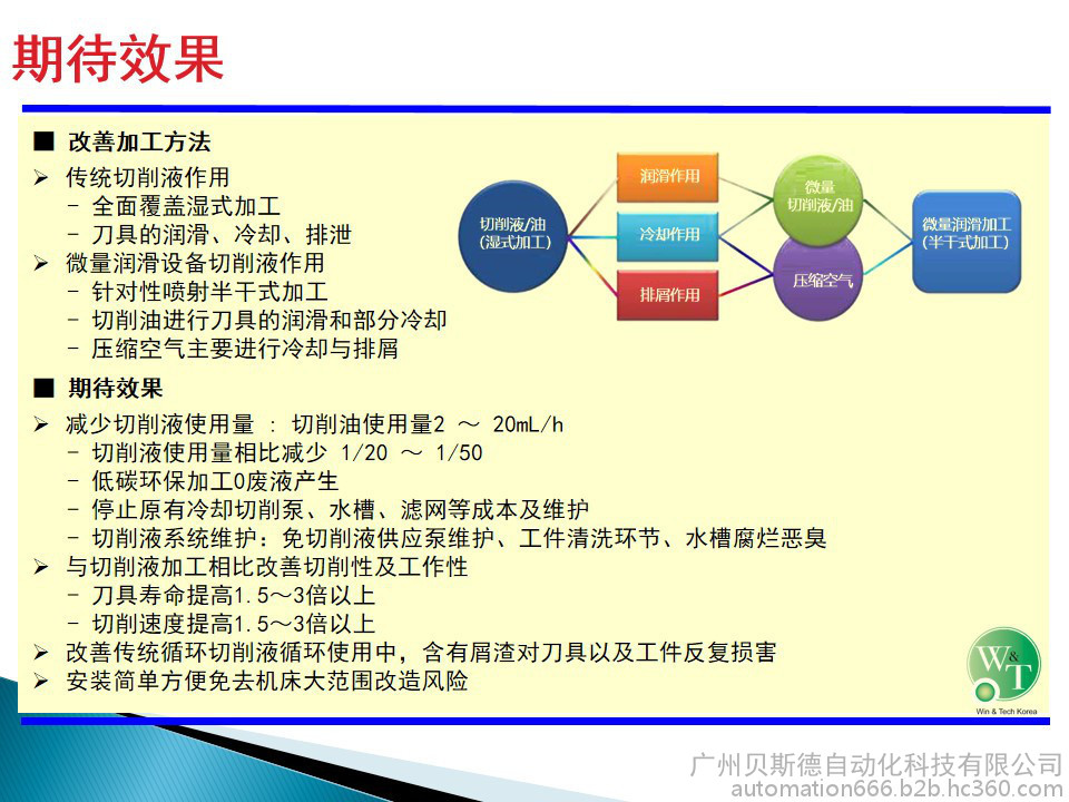 MQL加工? MQL (Minimum Quantity Lubrication) 是一种微量润滑加工方式,把切削油雾化成微小均匀颗粒与压缩空气喷射至指定加工点,以提高润滑冷却的新概念加工法,通过使用环保切削油彻底解决现有切削液带来的一切问题。不仅在加工速度和刀具寿命都有所改善提高工厂生产性。