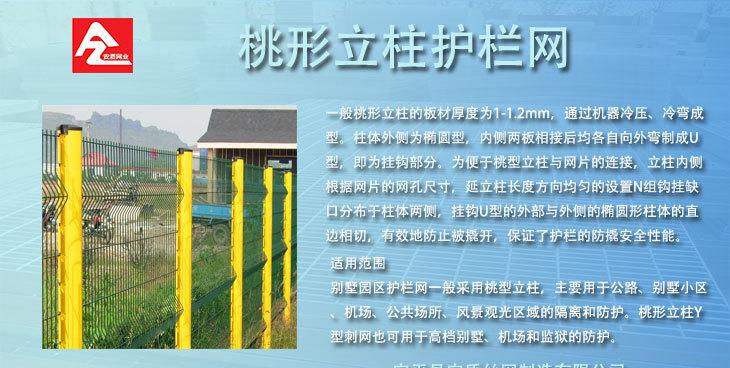 | 适用范围 | 别墅园区护栏网一般采用桃型立柱,主要用于公路、别墅小区、机场、公共场所、风景观光区域的隔离和防护。桃 |