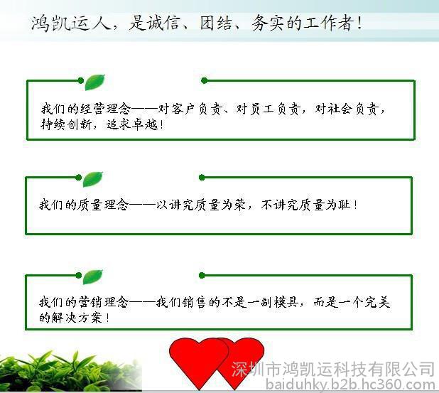 给我们彼此一次合作的机会,您一定会为您的选择而感到欣慰,而我们会为您的选择而感到自豪,您的选择是对我们的信赖,您的满意是对我们的动力,深圳市鸿凯运科技有限公司热诚欢迎新老客户前来咨询洽谈.