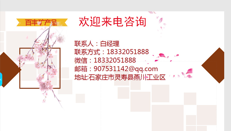 灵寿县百丰矿产品加工厂位于山清水秀的太行山脚下。公司地理位置优越,南距省会石家庄60公里,东距天津港口320公里。它是自然矿物建材型产品的生产者。它以科技创新为先,非金属矿材料开发为本,以技、工、贸等多方面人才为核心,成为集研发,矿采,加工,销售为一体的新型集成企业。 灵寿县百丰矿产品加工厂是石英砂、圆粒石英砂、彩砂、萤石粉、云母粉、重钙粉、高岭土、岩片、负离子粉、蛭石粉、果壳木粉等产品专业生产加工的公司,拥有完整、科学的质量管理体系。灵寿县百丰矿产品加工厂的诚信、实力和产品质量获得业界的认可。欢迎各界朋友莅临参观、指导和业务洽谈。