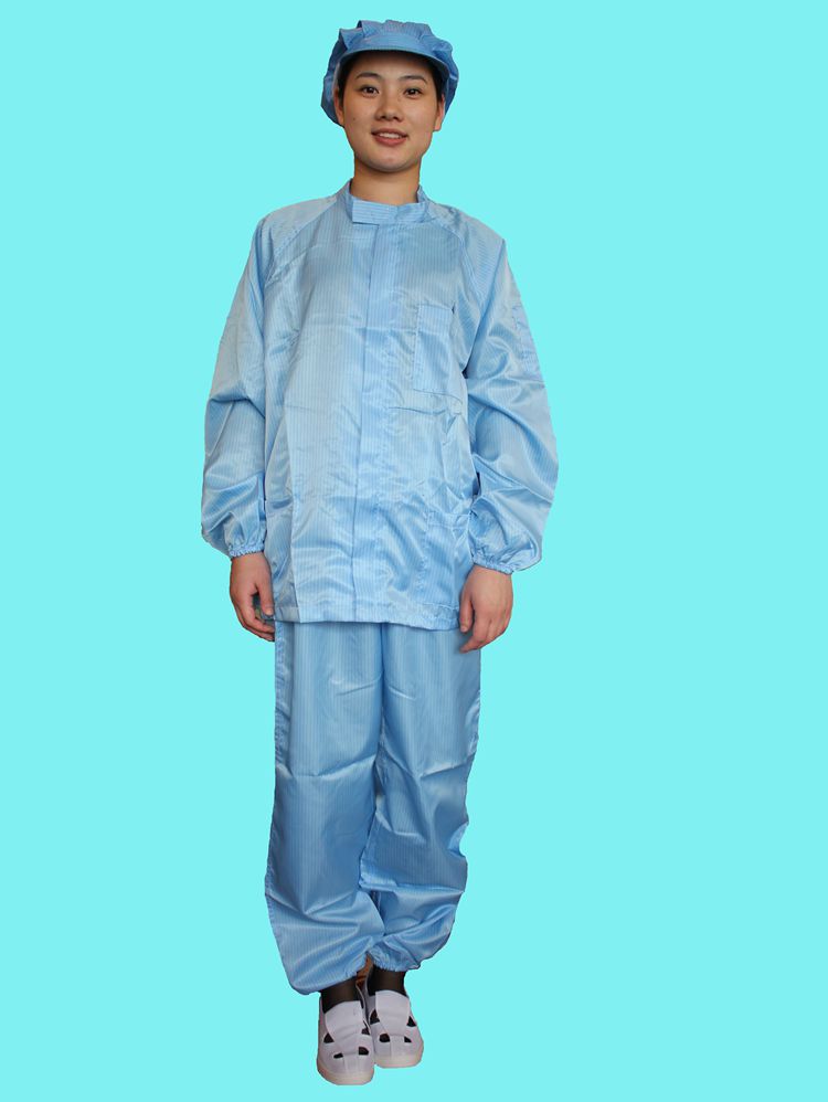 防静电工作服是由专用的防静电洁净面料制作。具有防静电、防尘性能,薄滑,织纹清晰的特点。在制作成衣过程中采用专用的包缝机械,有效减少微粒的产生。无尘的粘扣带避免了因掉毛污染环境。根据级别要求提供不同款式,并采用导电纤维缝制,使服装个部分保持电气连续性;袖管裤管为特有的双层结构,内层使用导电或防静电罗纹,从而满足无尘环境的要求.