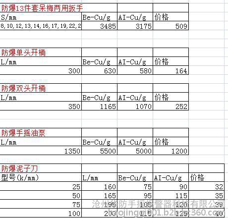 铝铜合金防爆工具是用贵重稀有金属合成、熔炼、锻造而制成工具后,表面呈黄色。工作面硬度HRC25°以上,抗拉强度δ b> 75-85kgf/mm,其它技术指标全部达到国外同类产品先进水平。在易燃气体乙烯(浓度7.8%)空间连续使用均确保安全,冲(撞)击、摩擦、落锤均不产生火花**