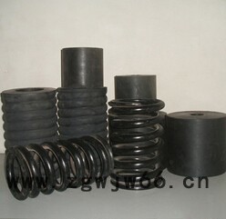 1、橡胶弹簧介绍 橡胶弹簧包括橡胶弹簧和复合橡胶弹簧。橡胶弹簧:是一种高弹性体,制作材料有普通橡胶。橡胶弹簧弹性模量小,受载后有较大的弹性变形,借以吸收冲击和振动。它能同时受多向载荷,但耐高温性和耐油性比钢弹簧差。如有特殊要求可用耐油橡胶制成。该产品减振效果好,共振领域小,使用寿命长,成本低,还有良好的耐寒性,优良的气密性,防水性,电绝缘性,是减振的**选择。复合橡胶弹簧:是由金属螺旋弹簧及其外边包裹的**硫化橡胶共同构成。集金属弹簧和橡胶弹簧的优点于一体,克服了金属弹簧刚性大、工作噪音高及橡胶弹簧承重量小、形状及机械性能稳定性差等缺点。具有更高的载荷量和大变形量、减震降噪效果更好、工作平稳、共振区间短等优点。2、橡胶弹簧特点:橡胶弹簧形状不受限制,有较大的弹性变形,容易实现非线性要求,减振隔音效果良好。复合橡胶弹簧相比较橡胶弹簧,前者形状受金属螺旋弹簧限制,线性要求高,重量重,但是其承重载荷量大的优点却不是纯橡胶弹簧可比拟的。优点(1)形状不受限制,各个方向的刚度可以根据设计要求自由选择;(2)弹性模量虽小,可以得到较大的弹性变形,容易实现理想的非线性特性;(3)具有较高的内阻.这对于突然冲击和高频振动的吸收以及隔音具有良好的效果;(4)同一橡胶弹簧能同时承受多向载荷,从而使系统的结构简化;(5)安装和拆卸简便,无需润滑,有利于维护保养.缺点(1)耐高低温和耐油性比钢弹簧差;(2)工程中用橡胶弹簧,形状比波纹管简单,但要**计算它们的弹性特性却相当困难;
