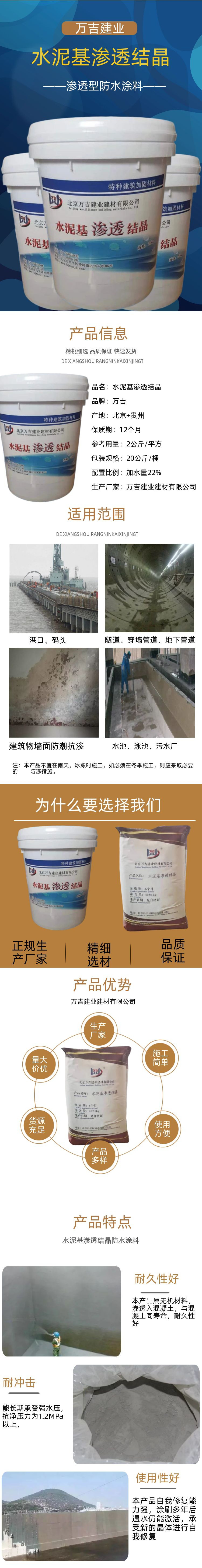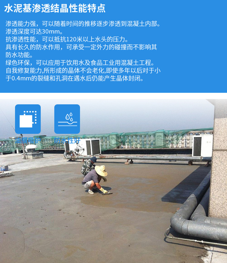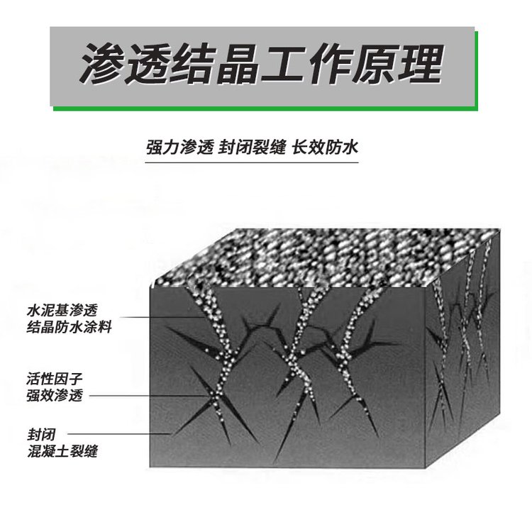 水泥基渗透结晶防水涂料产品耐老化性能好,遇高温不流淌,低温不脆裂,使用寿命长,性价比高。渗透封堵孔隙,使水无法进入混凝土,达到防水防潮效果!防水体系与混凝土形成一体,防水层不怕磕碰,能承受一定的外力作用。即使涂层破坏也不影响防水性能。