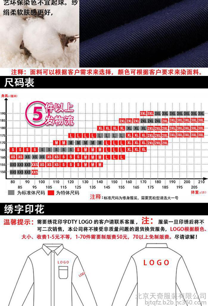 北京天奇服装有限公司创办于2005年,成立2006年、拥有外贸进出口权,专业提供各种外贸服装、工作服、T恤衫、文化衫、棉服、羽绒服、防寒服、西服、广告衫、帽衫、风衣、牛仔裤、牛仔夹克、牛仔马甲、夹克、衬衫、马甲、帽子、职业装、防静电服、防静电鞋、防阻燃服、制服、工服、运动服、保洁服、医院制服、护士服、购物袋、帆布袋、礼品袋、保安服、劳保服装、防砸鞋、安全帽等定做加工厂家、曾和国内外多家公司合作,并建立了长期稳定的业务关系,产品远销欧美、乌克兰、俄罗斯、意大利等一些**和地区。