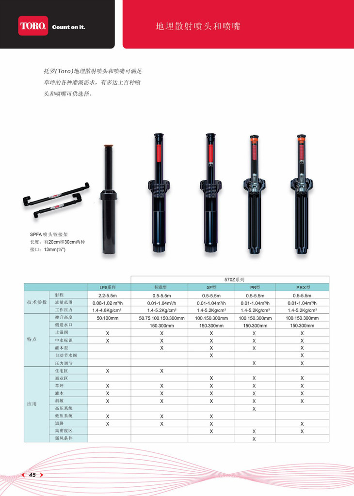 ·可以安装所有的托罗(Toro)散射喷嘴—包括570MPR等喷嘴强度喷嘴,TVAN可调角度喷嘴,PSN系列喷嘴,涌泉喷嘴和低仰角喷嘴