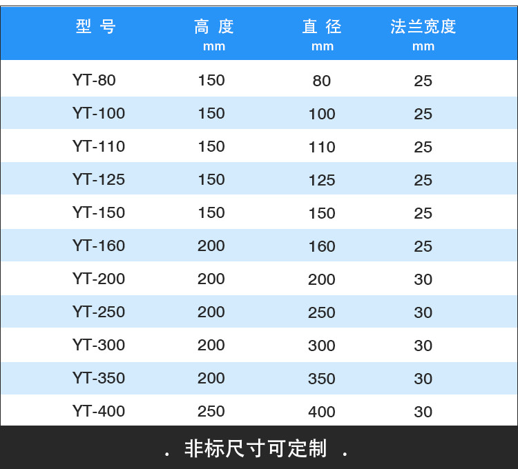 | 类型/型号 | 直径80mm,直径89mm,直径100mm,直径110mm,直径125mm,直径150mm,直径160mm,直径200mm,直径250mm,直径300mm,直径350mm,直径400mm,其他尺寸定制 |