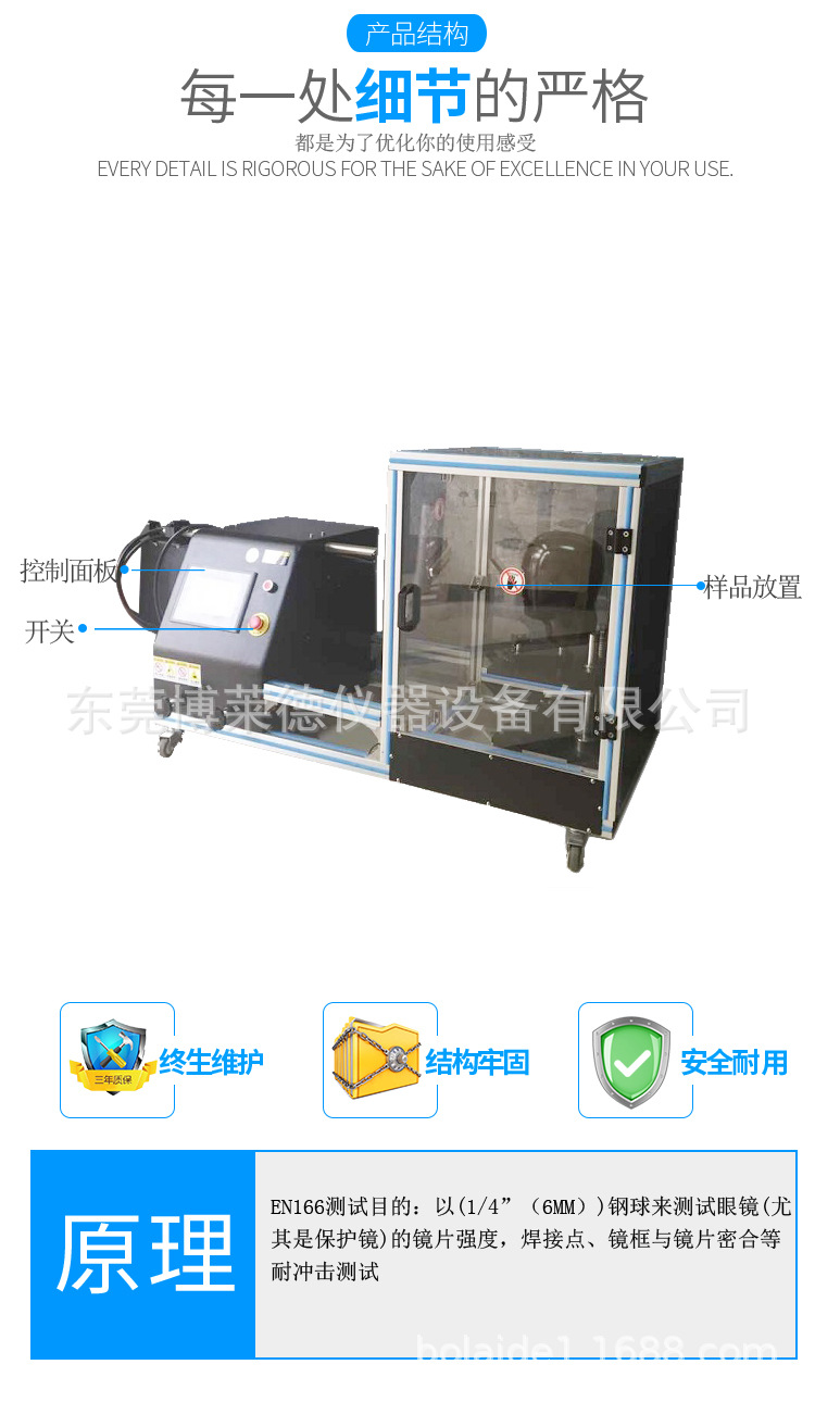 测试目的:以(1/4”(6mm))钢球来测试眼镜(尤其是保护镜)的镜片强度,焊接点、镜框