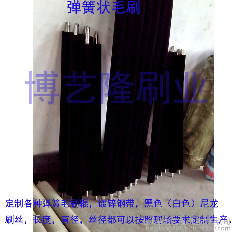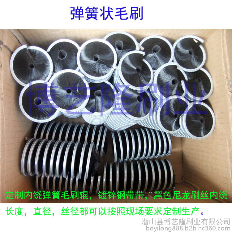 潜山县博艺隆刷业有限公司生产的弹簧刷(弹簧刷辊)可选用的刷丝有:聚丙烯刷丝(PP)、PA610/PA612/PA1010、进口杜邦丝、猪鬃、马鬃、墨西哥剑麻、镀铜钢丝、不锈钢丝、铜丝、磨料刷丝(碳化硅、氧化铝)等。