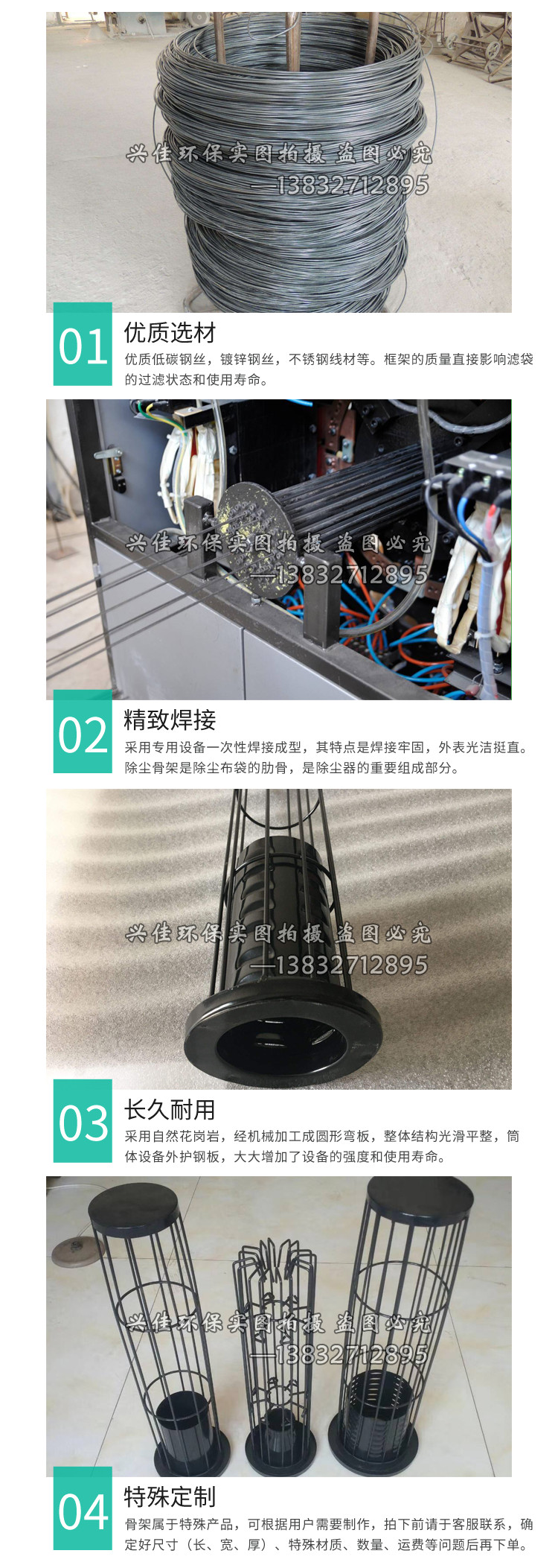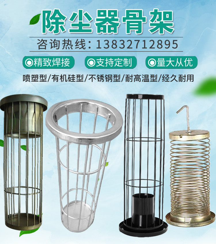 除尘骨架是袋式除尘器不可缺少的主要配件之一,它可以可兼容六、八、十、十二、十六、十八、二十、二十四根筋,?除尘骨架的作用是非常大的,被广泛应用在冶金、化工、焦化、发电、有色冶炼、钢铁、建材、煤矿等行业。