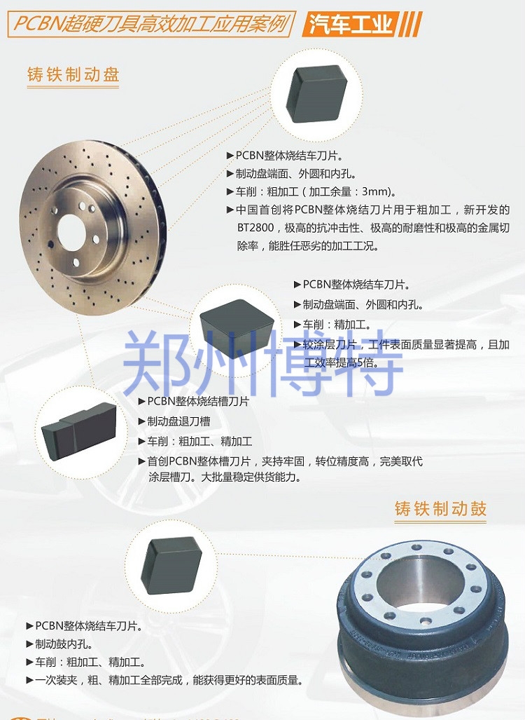 郑州博特材料专注于超硬刀具的研发制造,秉着为制造商提供原材料,为经销商提供产品,为用户提供服务的经营理念,为客户提供各种结构形式的PCBN刀片,包括整体烧结PCBN刀片、整体焊接PCBN刀片和复合焊接PCBN刀片,以满足各类加工环境需求。多种规格型号齐全,量大从优,欢迎咨询。