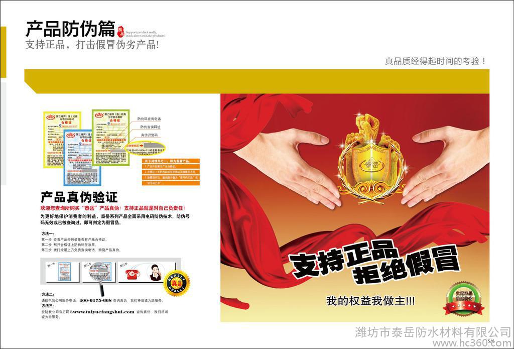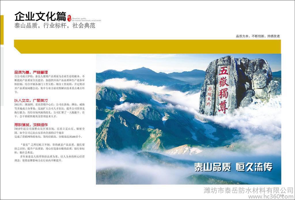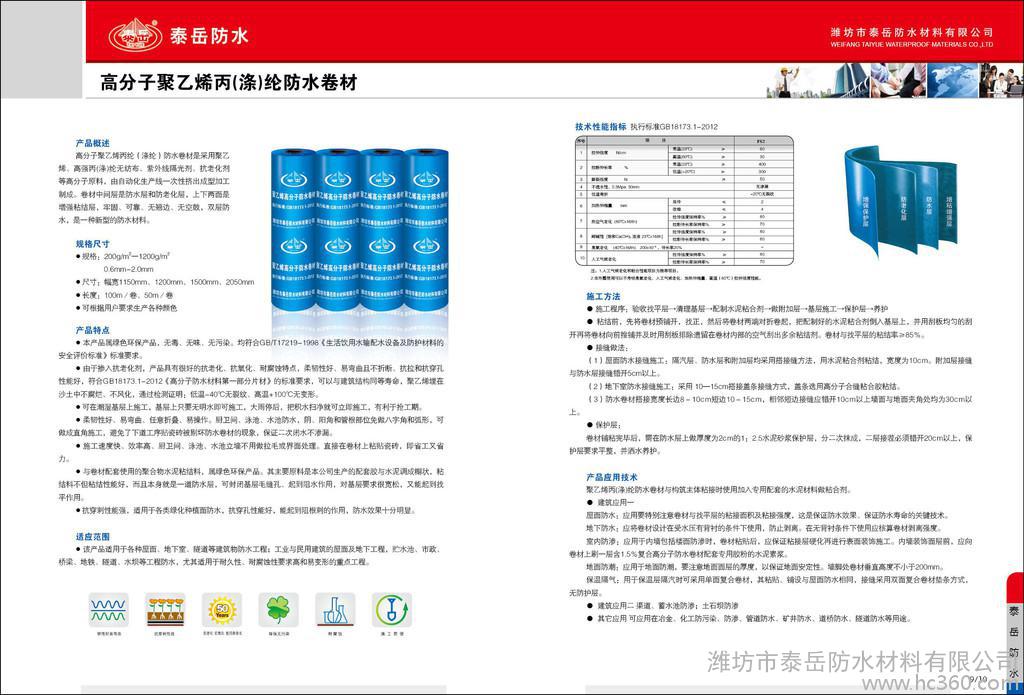 潍坊市泰岳防水材料有限公司是集科研、生产、设计、销售、服务于一体,集技术、品质、服务于一身的新型技术密集型企业。经过多年的实践和努力,我们在高分子产品方面长期居于主导地位**了高分子防水行业的发展方向,“泰岳”做为一面旗帜,在高分子领域代表的是科技、品质、服务和高可靠性。