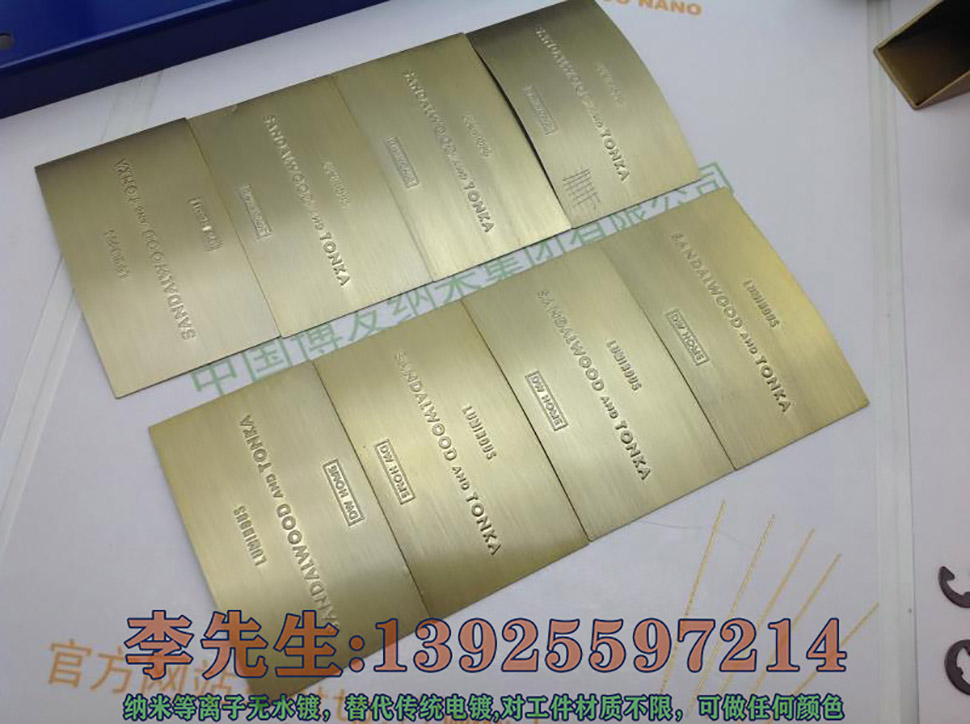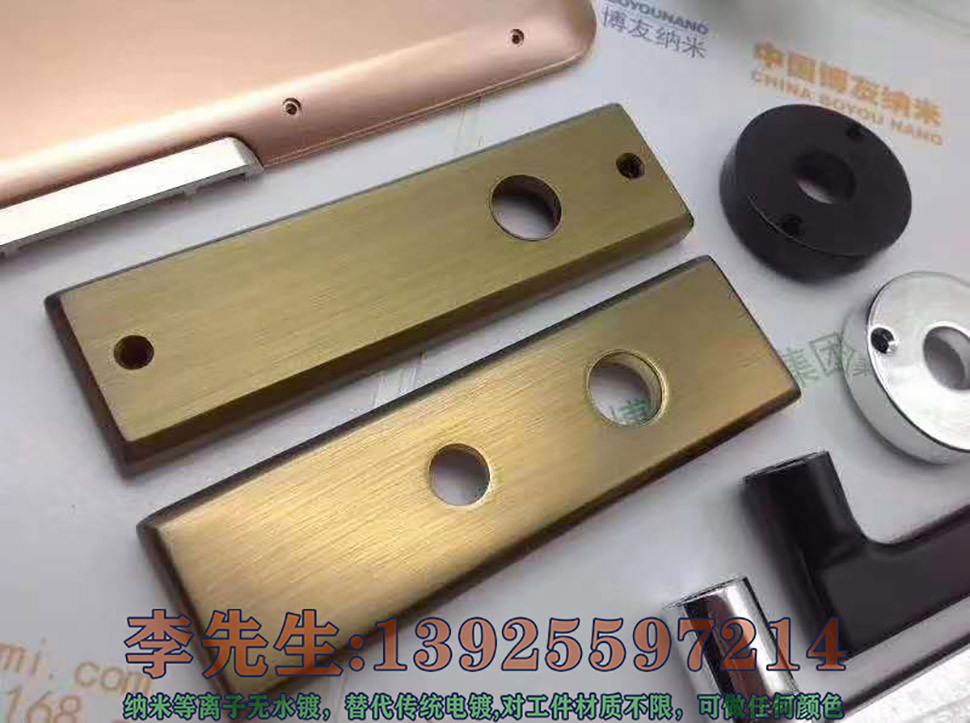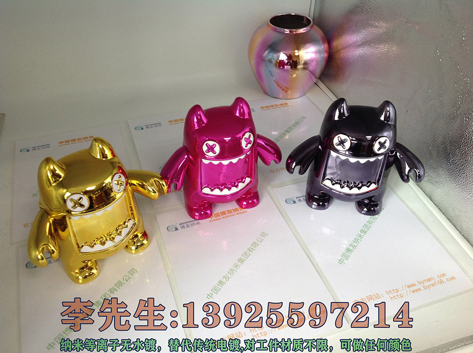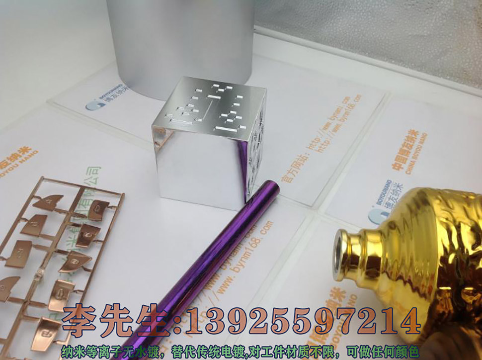 新型纳米喷镀相对于传统电镀来说,主要有六大优势: 1. 绿色环保,无三废排放 2. 加工不受产品大小形状限制 3. 加工颜色随心所欲,可呈现金、银、铬、古铜及各种色彩 4. 投资少、成本低,无需大型规模和设备 5. 使用安全,即使不小心沾到手上也不会有任何伤害 6. 操作简单,无需抛光,无需做导电层 纳米喷镀广泛用于金属、树脂、发泡,木材、陶瓷、玻璃、塑胶等各种材质,主要应用于工艺品、饰品、家俱、广告字、汽车、电器电子等各行业。 如果对我司工艺感兴趣,可以寄样品来我司,我司免费打样看效果。 联系人:李先生 13925597214