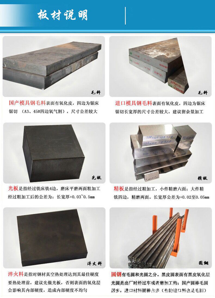 模具钢材: 锻打板厚度(圆钢):+1.5mm~ +5mm;