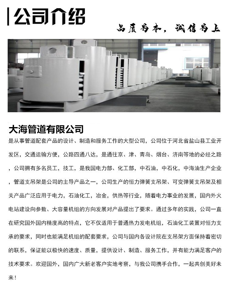 支吊架主要用于电厂汽水管道或锅炉设备、在运行中产生热位移及其设备装置上。根据管道受力情况计算确定的弹簧支吊架工作和热位移要求,本厂将弹簧支吊架按照设计荷载进行整定:即弹簧预压并所定冷态荷载位置上;同时标上冷态时的理论理论工作位置。