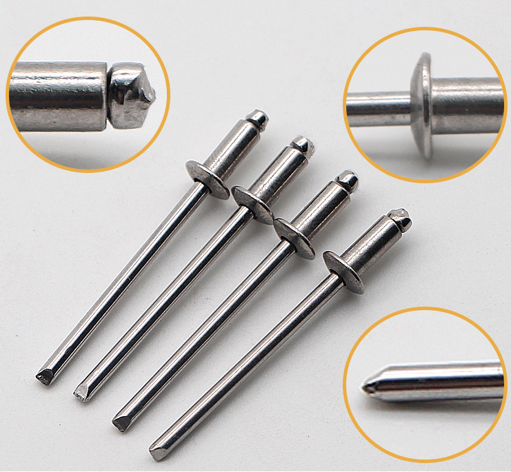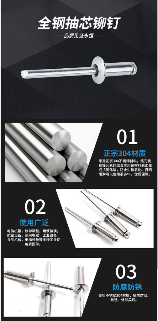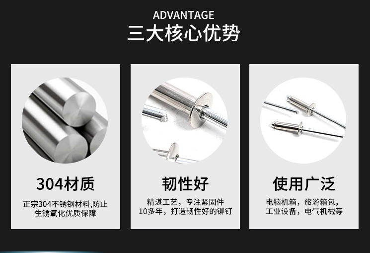 2、开口圆头不锈钢拉钉优点:适应不同材质之间的紧固连接,适应不需要拆卸的场合,可在工件的单面操作,工具简单容易操作,安装效率高。开口圆头铆钉缺点:不能调整松紧,不能拆卸。
