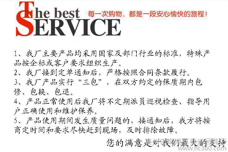 我厂建立了强有力的质量保证体系和生产过程的质量控制系统,严格执行**设计、生产标准,有严格的生产工艺过程和标准,有先进严格的检验、检测标准和手段,保证出厂产品合格率 ** 。 信守承诺、注重信誉、建立了诚信可靠、快捷、迅速、便利、周到的售后服务网络。除产品售后保修一年外;还长期提拱零配件和终身维修。设有专门的售后服务队,还可以根据客户的需要提拱“一条龙”服务。