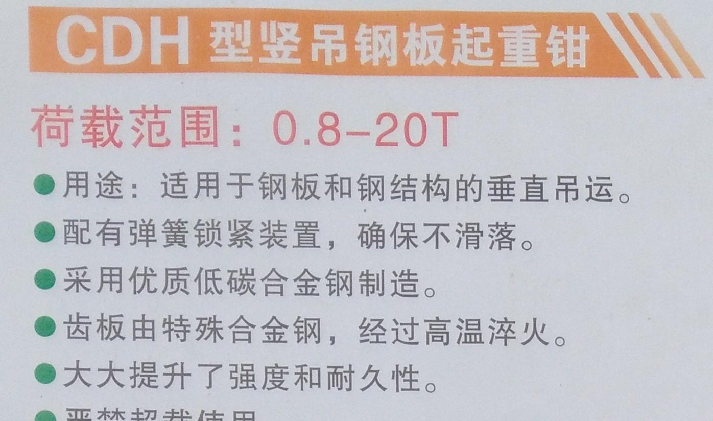 CDH型竖吊钢板起重钳由**合金钢制造,齿板由特殊合金钢经高温淬火而成,大大提高了强度和耐久性,并配备弹簧紧锁装置以确保不滑落,适用于钢板和钢结构的垂直吊运。