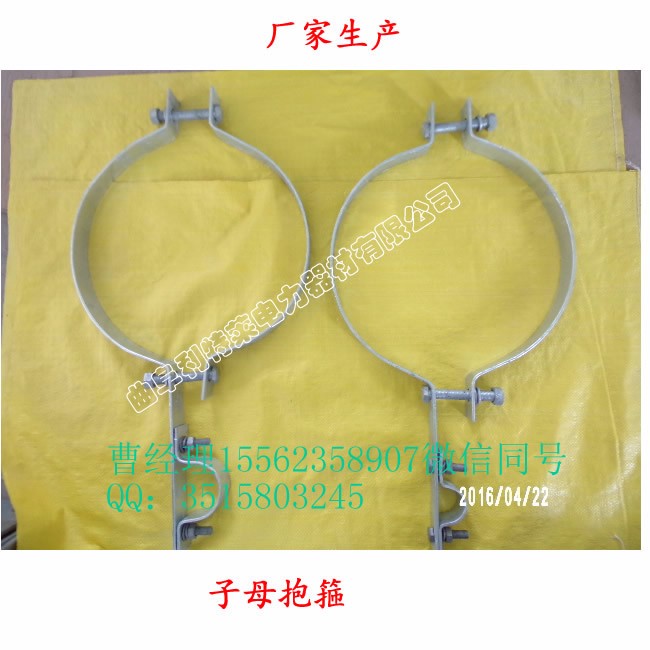 所谓抱箍是用一种材料抱住或箍住另外一种材料的构件. 它属于紧固件.,子母抱箍则适用于一个大抱箍安装在电线杆上面,另外一个小抱箍抱住光缆保护管的一种组合抱箍,材质是使用**4*40的钢板,表面进行热镀锌处理,订货时需要提供线杆的杆径和光缆保护管的直径,才能定做。